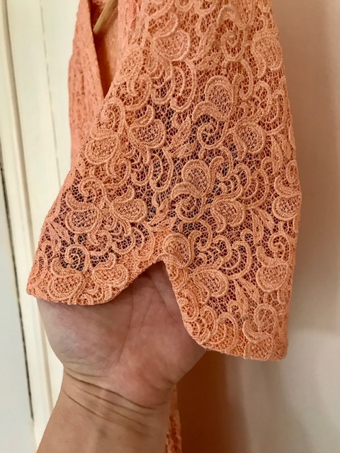 Jurk in maat medium met nieuwe rits (YKK). V-neck (bescheiden diepte) met plooitjes vanuit ‘t midden gedeelte naar de schouders. De onderkant is wijd, de lengte is 3/4. Heeft aan de rechterkant éen lus, voor de strik-riem in dezelfde stof. De jurk is vrij zwaar omdat het dik kant is, wel schijnt het een beetje door dus misschien is een onderjurk raadzaam. Zeker als je haar in de winter wil dragen, wat prima kan omdat het kant van zware kwaliteit is. Maat: Medium