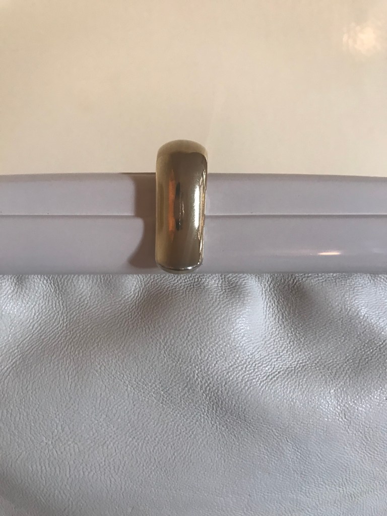 Clutch uit de tachtiger jaren van wit leer. De sluiting is gemaakt van kunststof in wit met gouden clip. Een funky vintage avontasje.