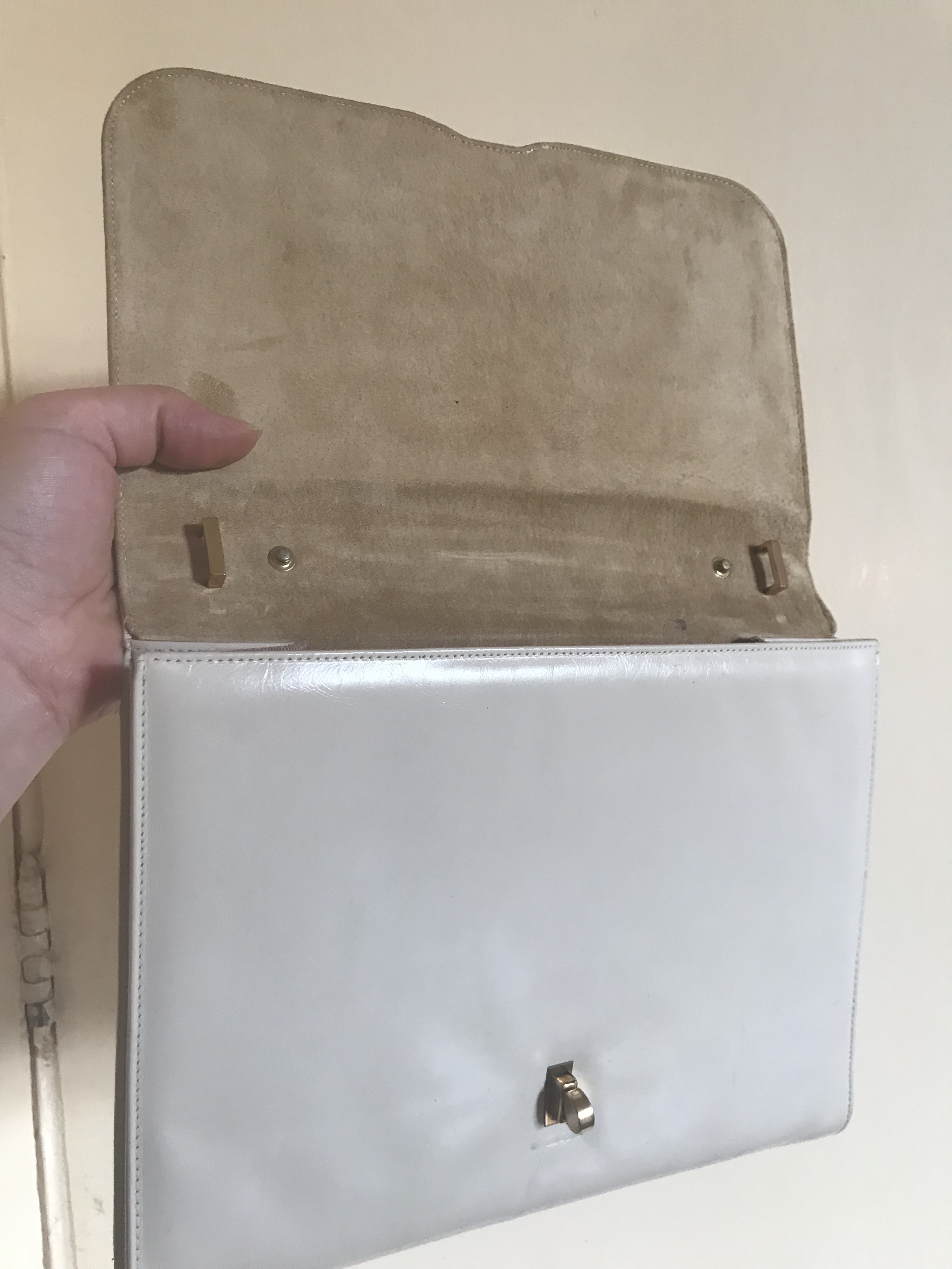 De tas ziet er prima uit, aan de binnen en buitenkant. De voering is gemaakt van suede. Het afneembare hengsel, in lakleer, ziet er niet meer zo nieuw uit helaas.