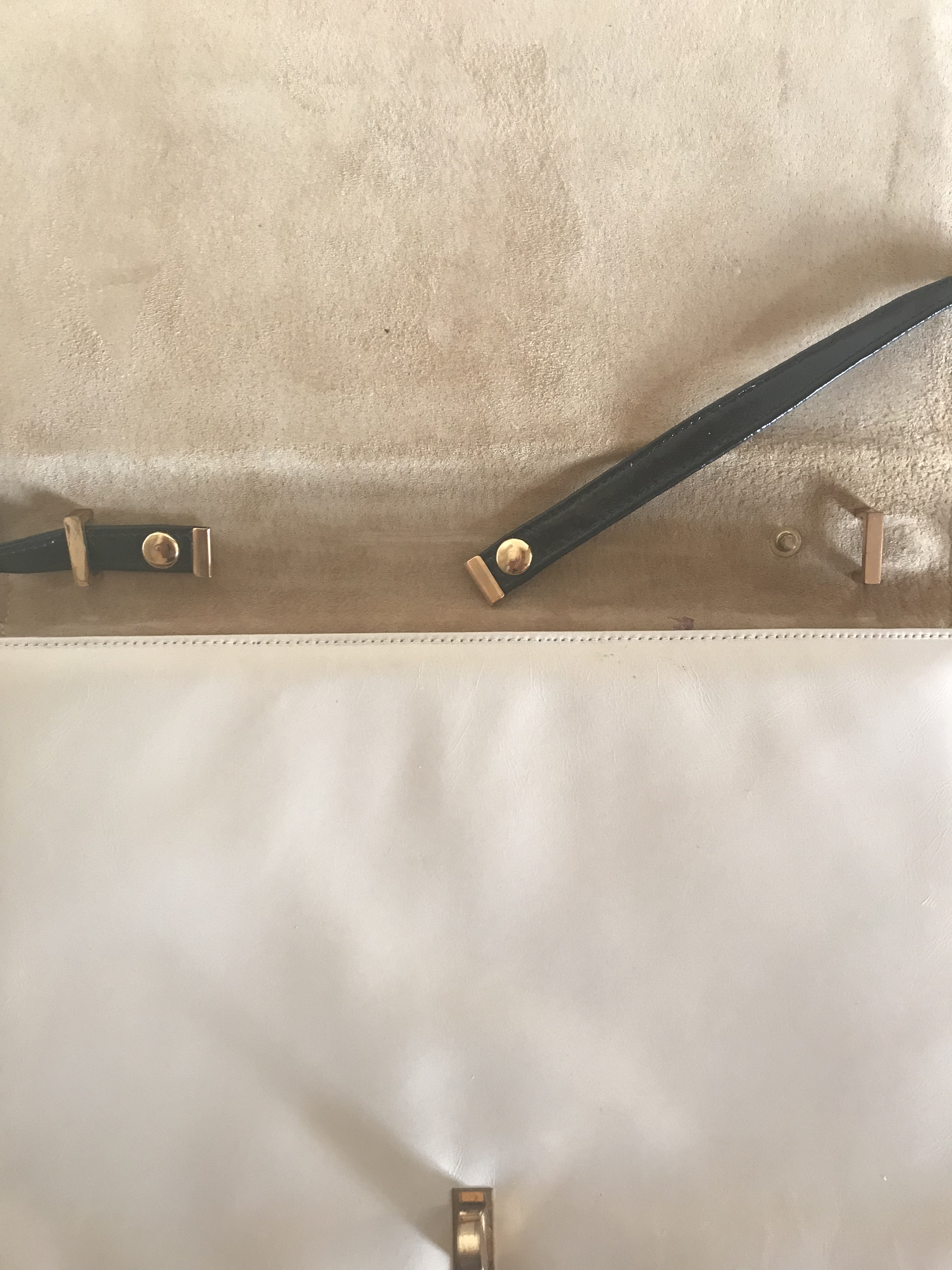 Jay Herbert leather clutch purse. Prachtige vintage 70s leren clutch van Jay Herbert: Amerikaanse makelij uit het warenhuis I. Magnin. In gebroken wit en gemaakt van superzacht kalfsleer. Het detail aan de voorkant is donkerblauw en het draai slotje is goud-kleurig.