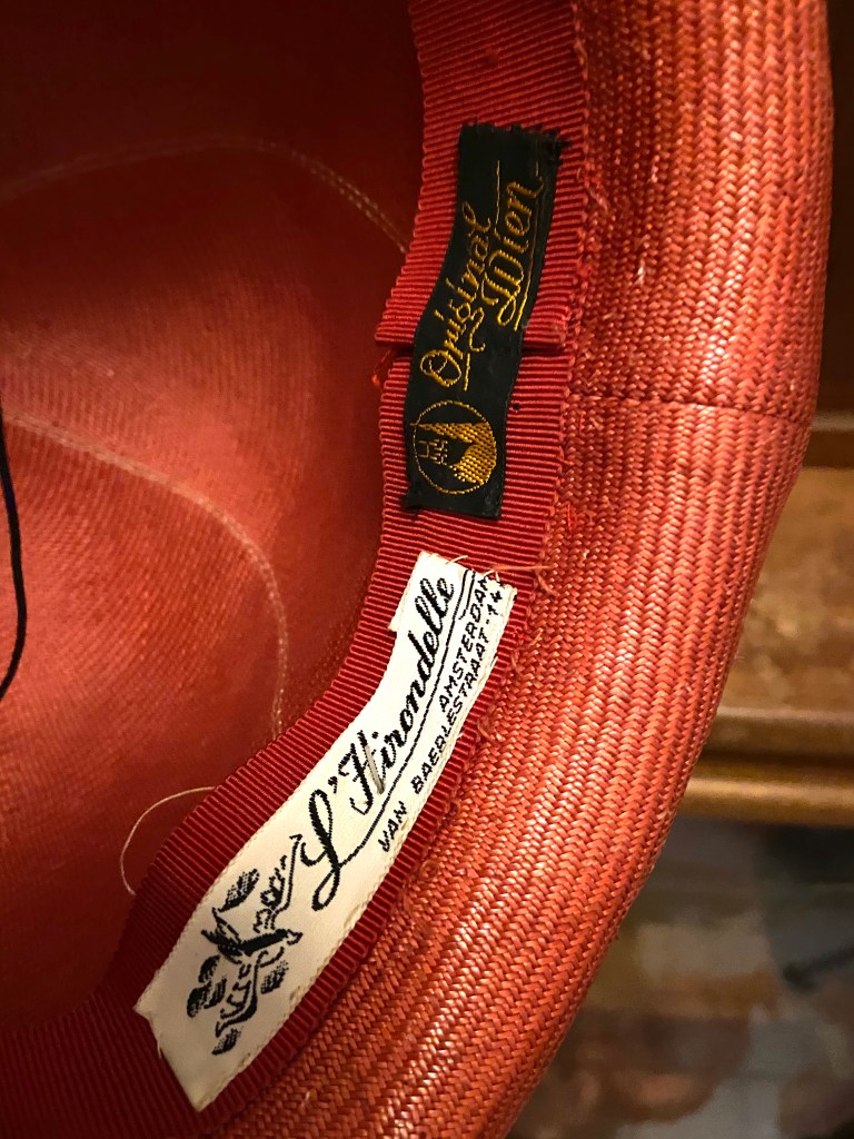 Een mooie rode gestructureerde hoed voor de zomer uit eind jaren ’60 of begin jaren ’70. Prachtig rond van vorm met rand en verfraaid met off-white stiksel aan de bovenzijde. Gemaakt door Original J Dien en met het label van de Amsterdamse hoedenwinkel Maison L’Hirondelle.