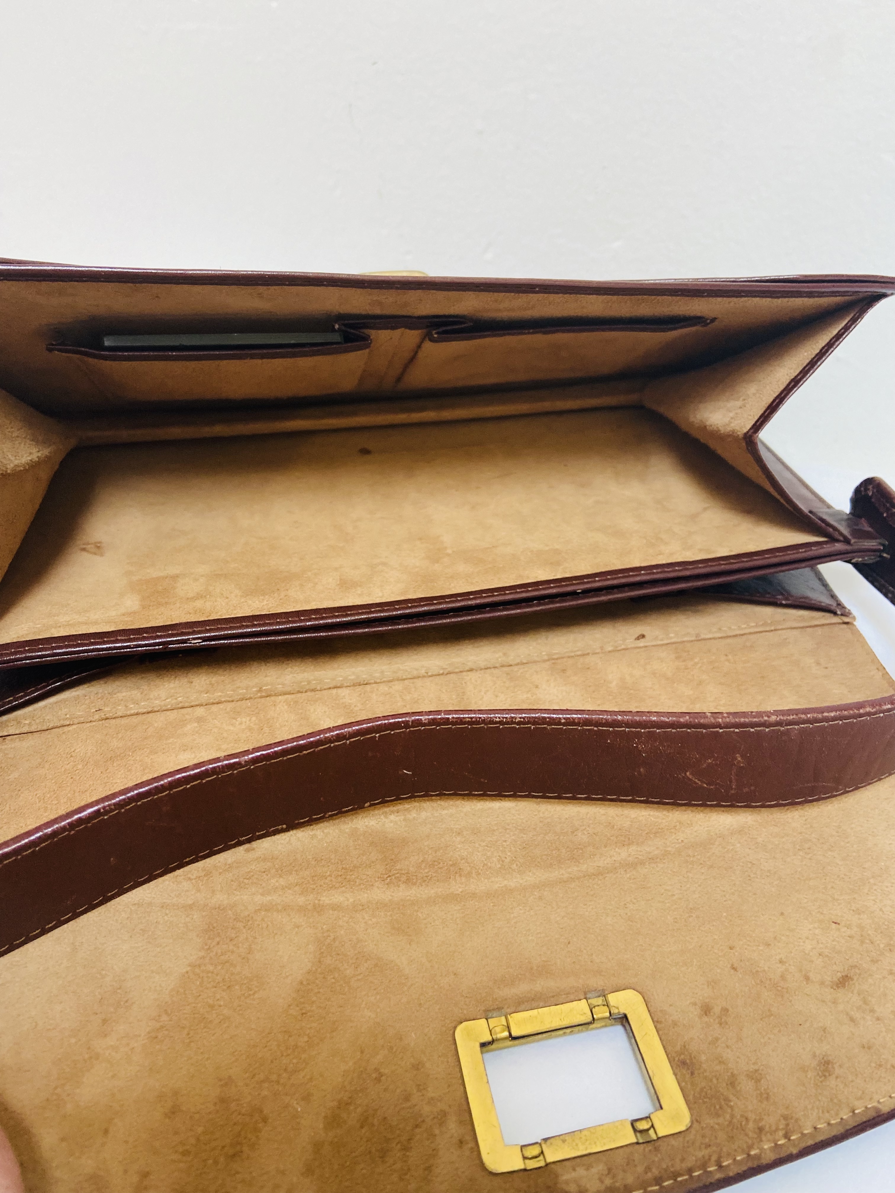 Rechthoekige leren hand- of schouder tas. Een simpel en strak ontwerp uit het begin van de 20ste eeuw vermoedelijk uit de jaren dertig gezien het strakke Art Deco onwerp met veel details. Het vintage tasje is gemaakt van bruin leer gevoerd met suede in naturel kleur, de hardware is gemaakt van goudkleurig metaal, het heeft een draai- sluiting midden voor. De tas is nog in goede staat maar heeft gebruikssporen aan de binnenkant van het hengsel.