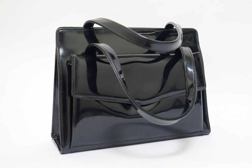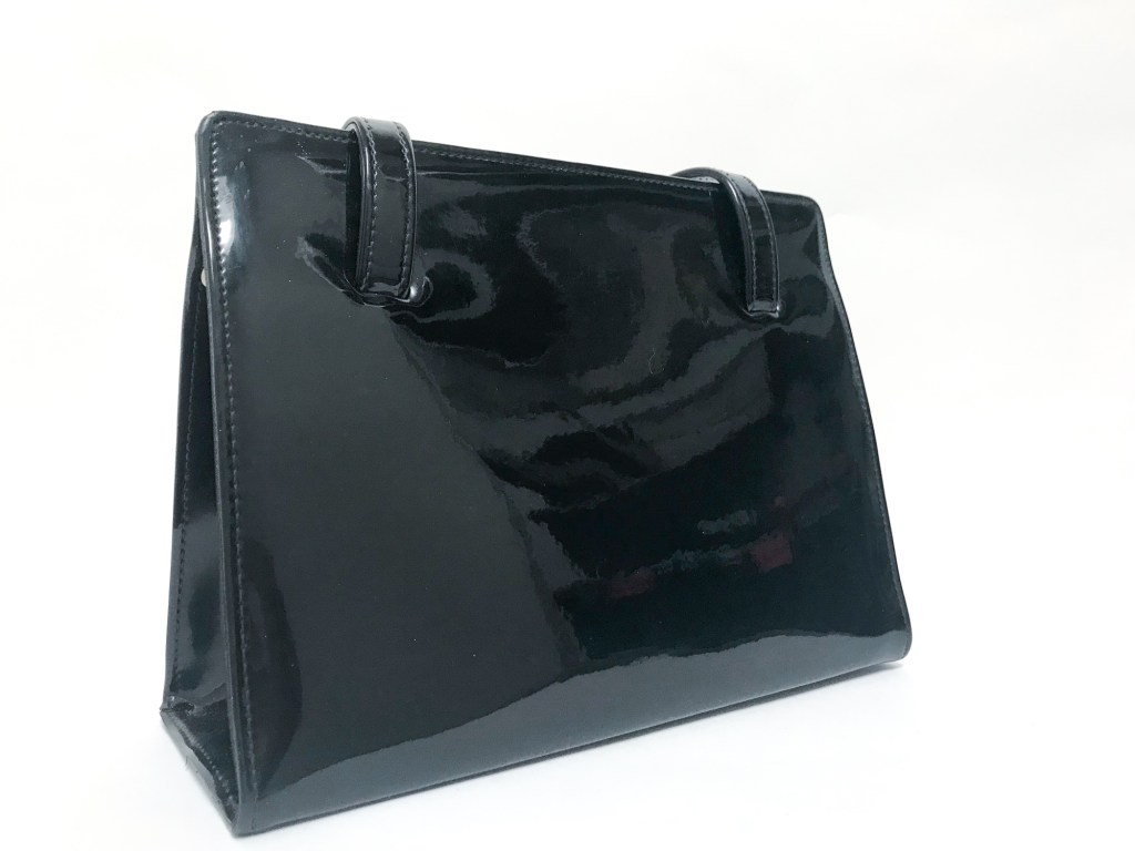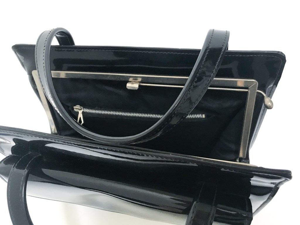 Grote handtas in zwart lak pleather. Met verborgen sluiting en een ruim voorvak. Alle hardware is zilverkleurig.