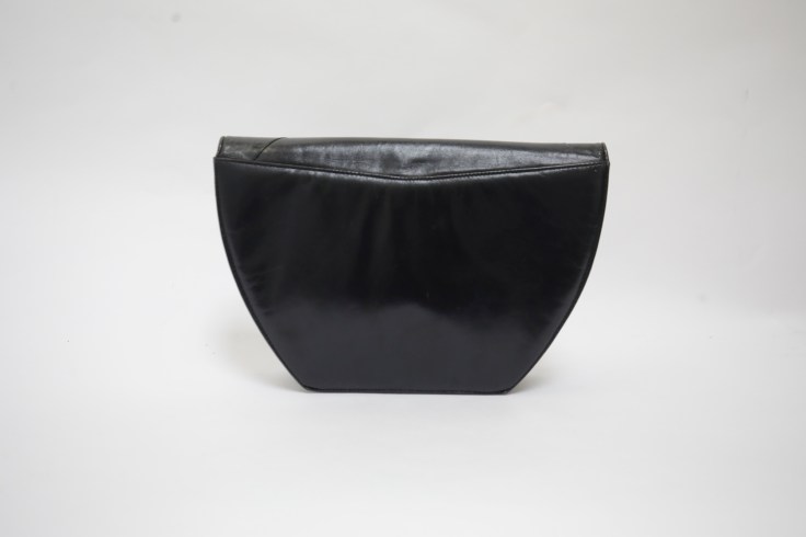 Black calfskin leather clutch bag with a folded, origami, detail on the front. The inside of the purse is also made of leather and has one compartement with a zipped section. Comes with a removable strap.