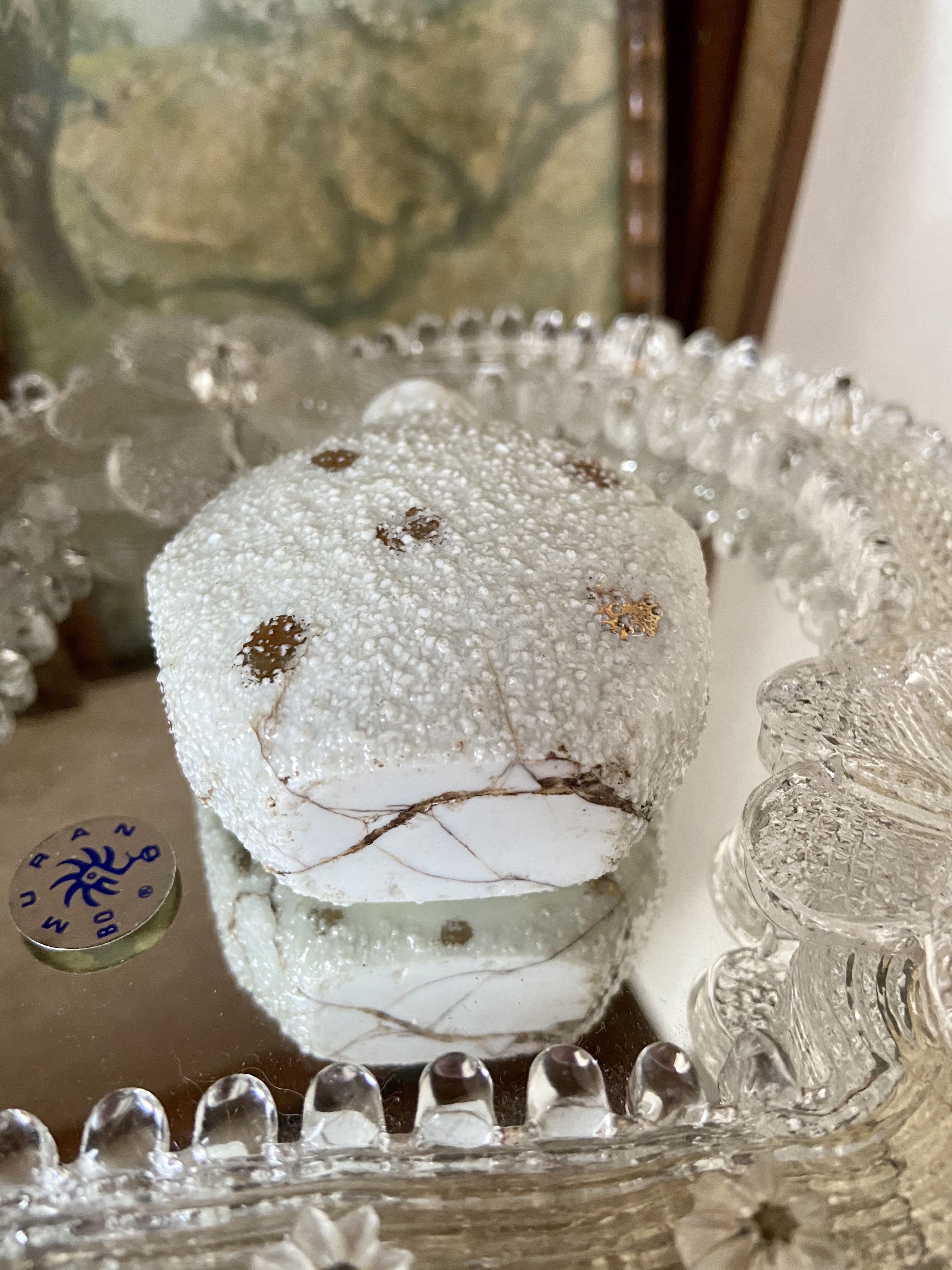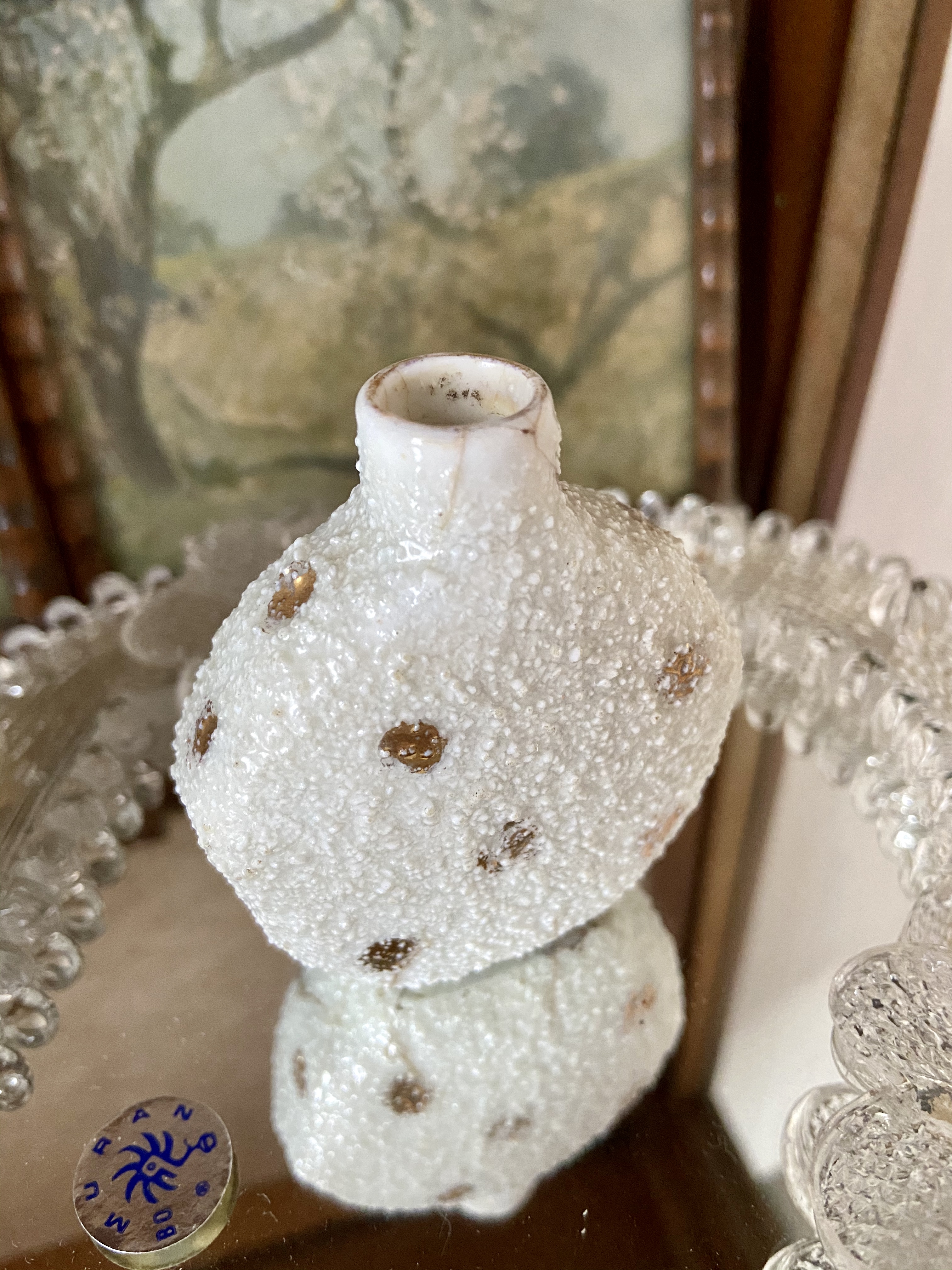Wit mini vaasje in porselein met een daarop een engeltje ofwel een putti, afgebeeld. Gedecoreerd met goudverf. Ooit gebroken maar gerestaureerd.