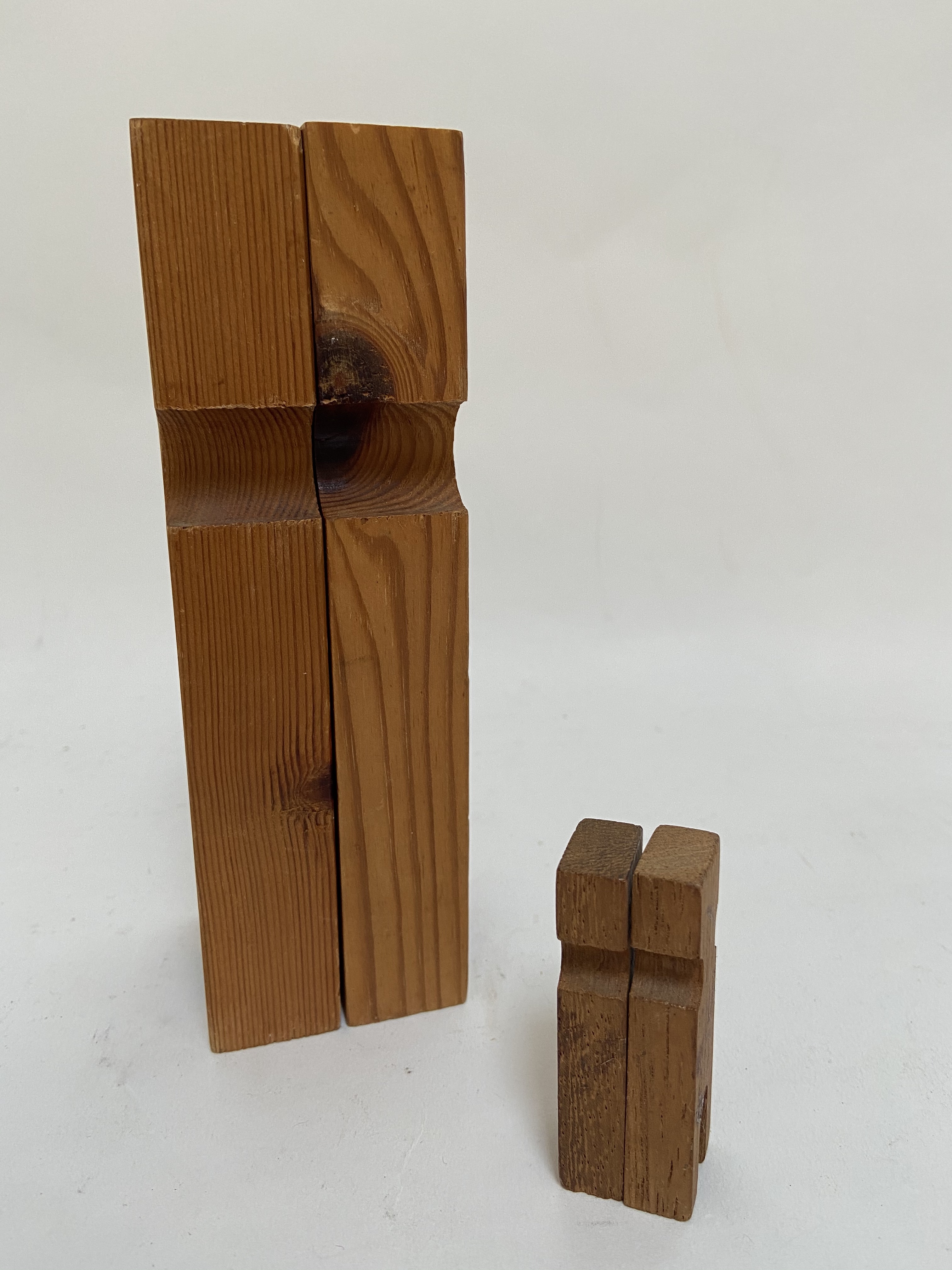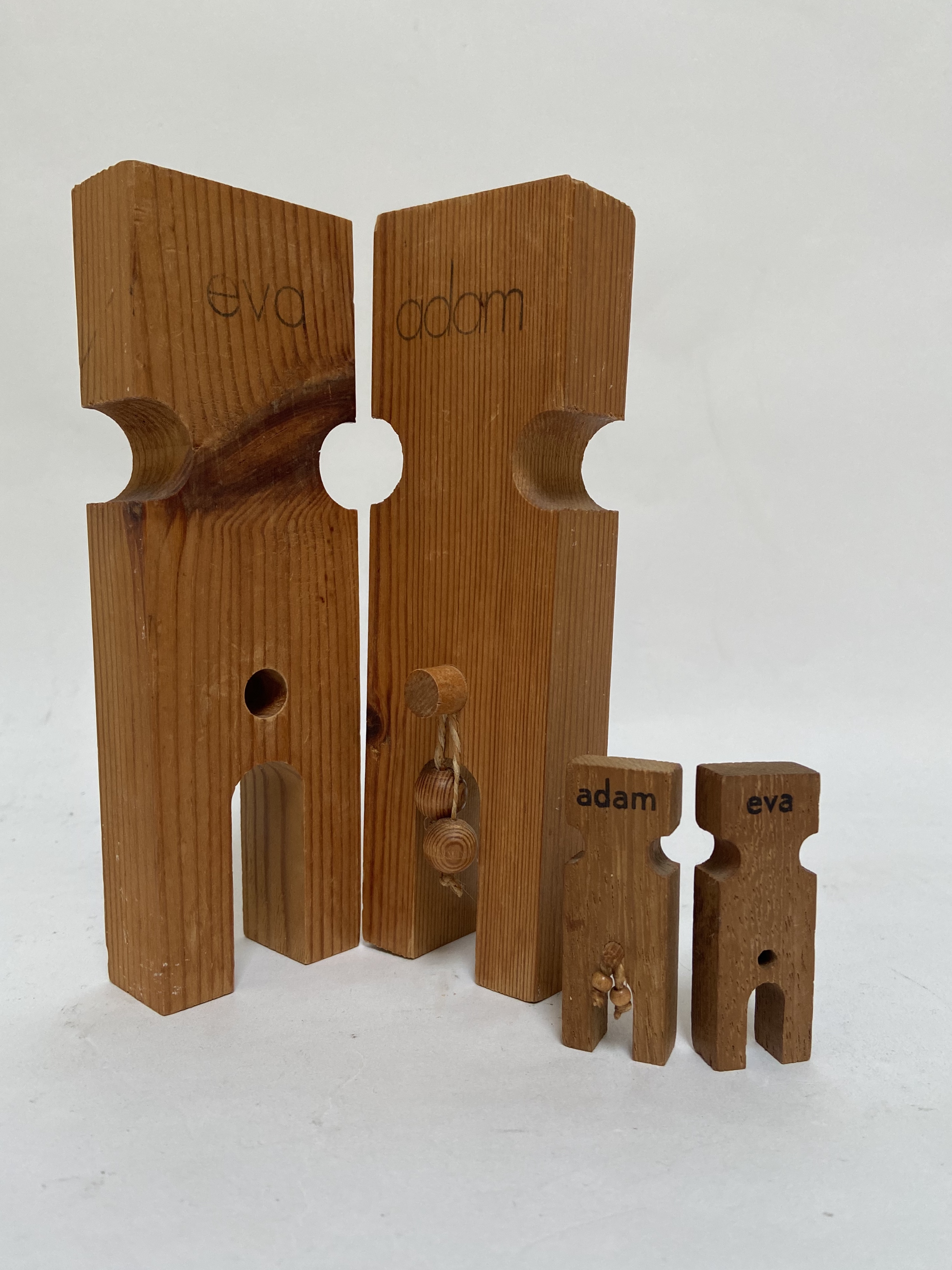 Typisch zeventiger jaren: Abstracte Adam en Eva gemaakt van hout en passend in elkaar! Vier stuks Adam en Eva (2 grote en 2 mini’s) Zijn vroeger gemaakt in alle talen van de wereld, deze komen uit nederland. Homedeco zoals het was in the seventies!