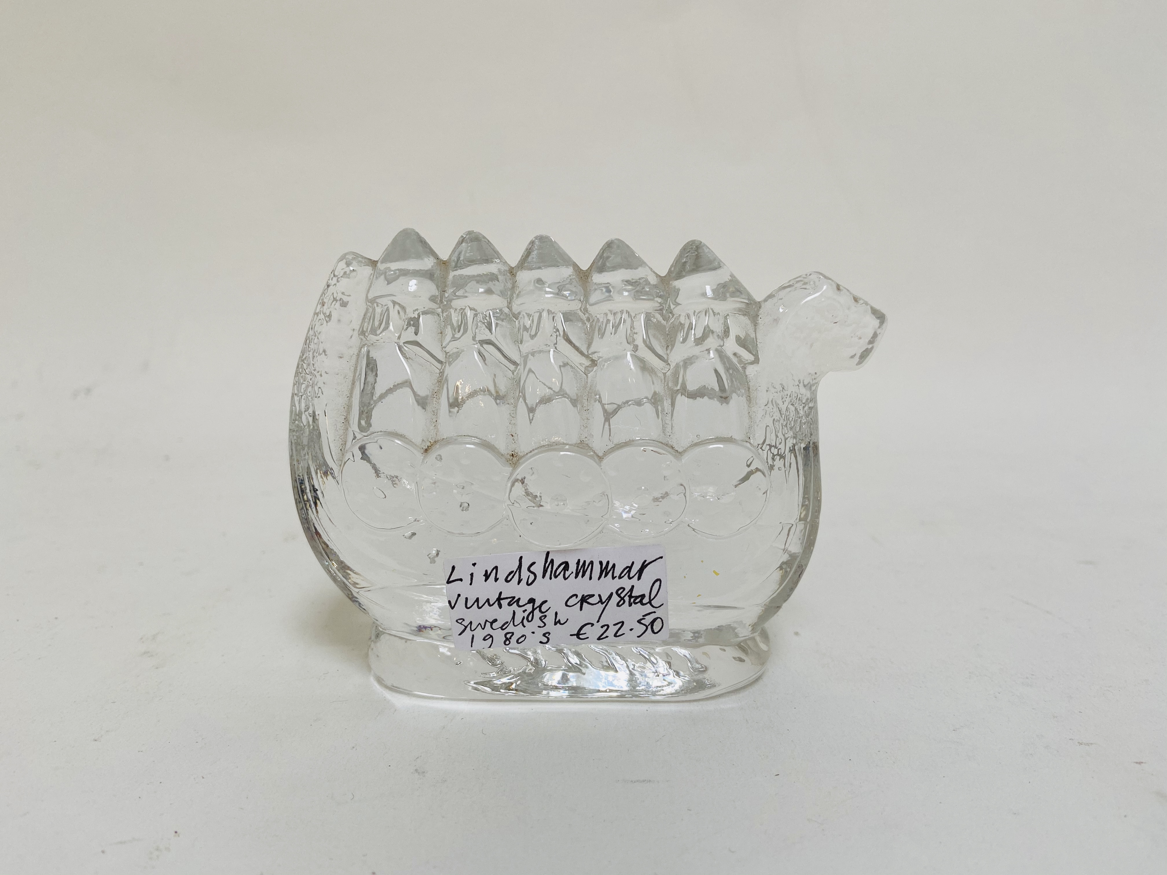 Vintage art glass uit de jaren 80 van Lindshammar uit Zweden: een viking schip in helder kristal!
