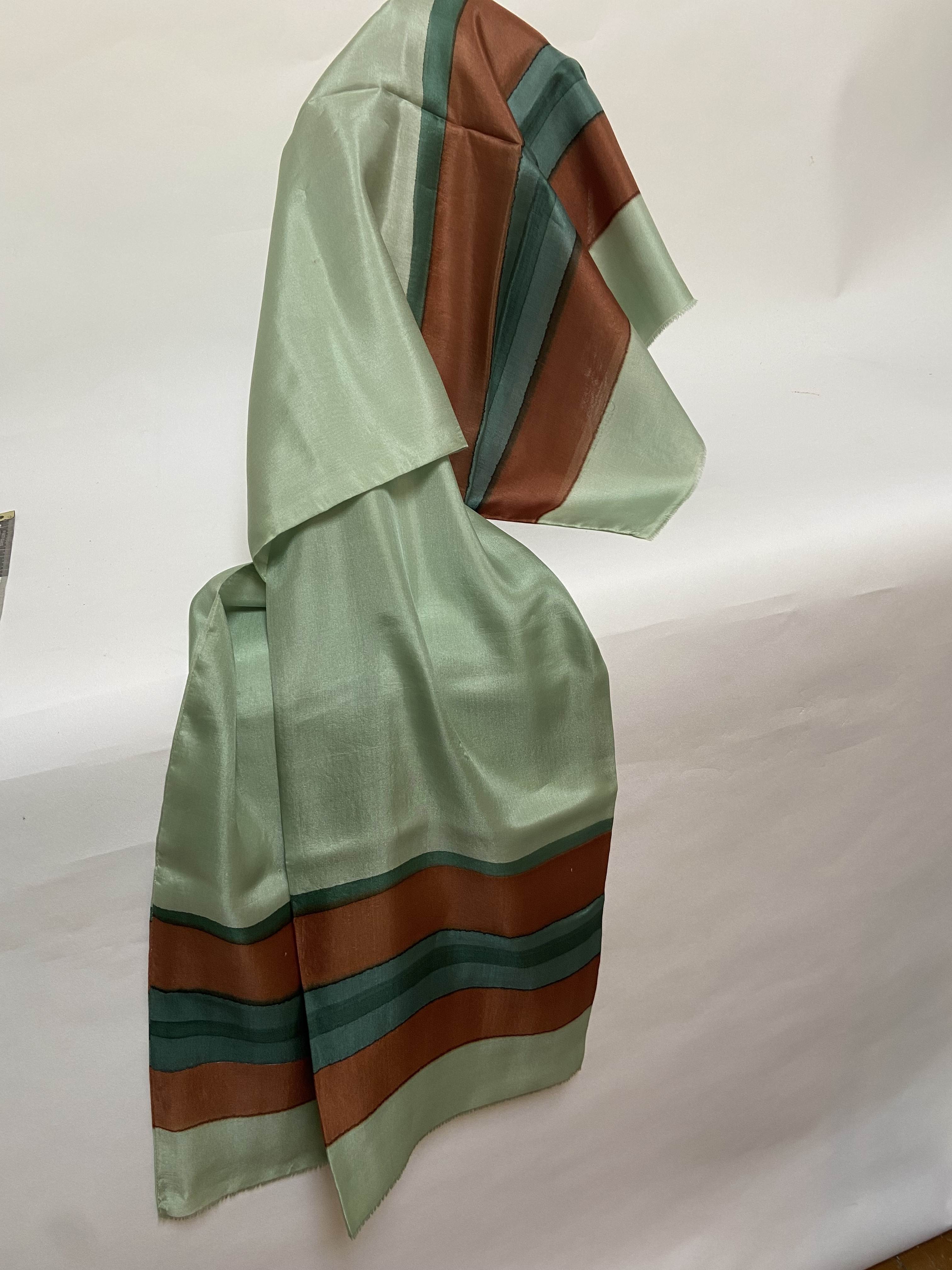 Langwerpige sjaal in pastel groen met geverfde strepen aan de uiteinden die onafgewerkt zijn (raw edge). Gemaakt van hele zachte, dunne zijde, dubbel dicht gestikt. Erg mooi, ook voor heren en mannen.