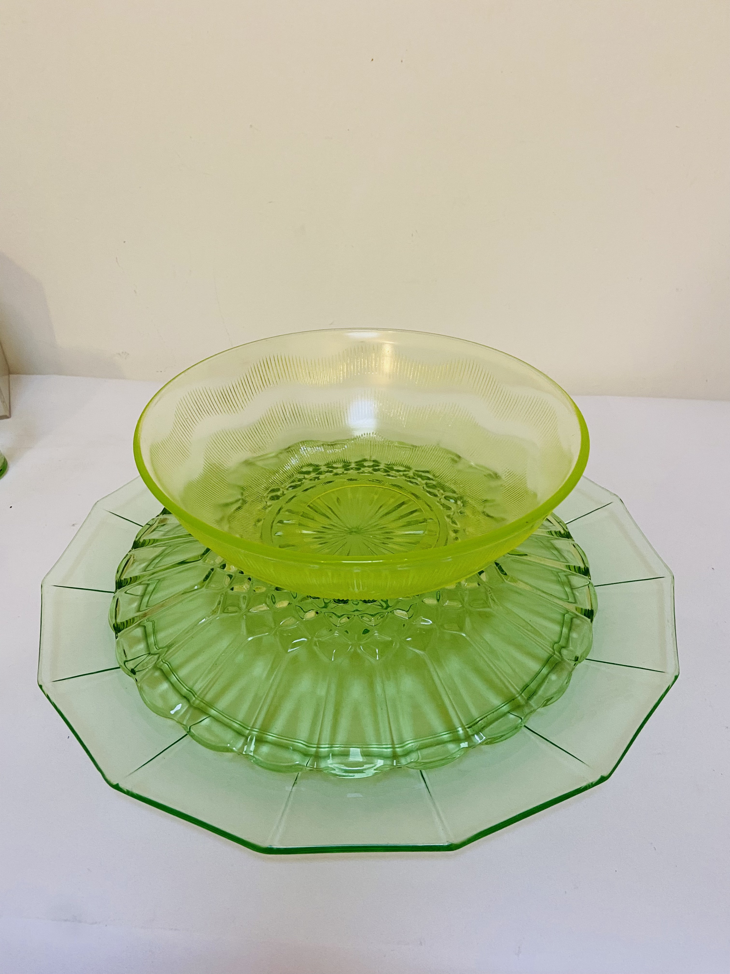 Uranium of Annagroen glas, diverse servies onderdelen gemaakt rond 1930/1940.